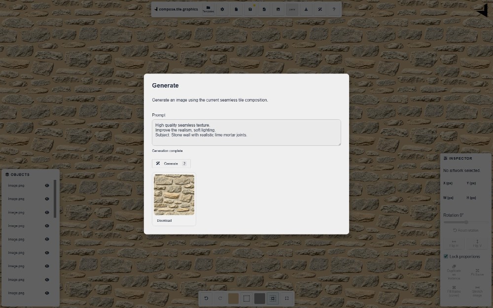 Note: the generative image works if it is close to common concept like brick mortar joints, other editing tools is required to make the specifics.